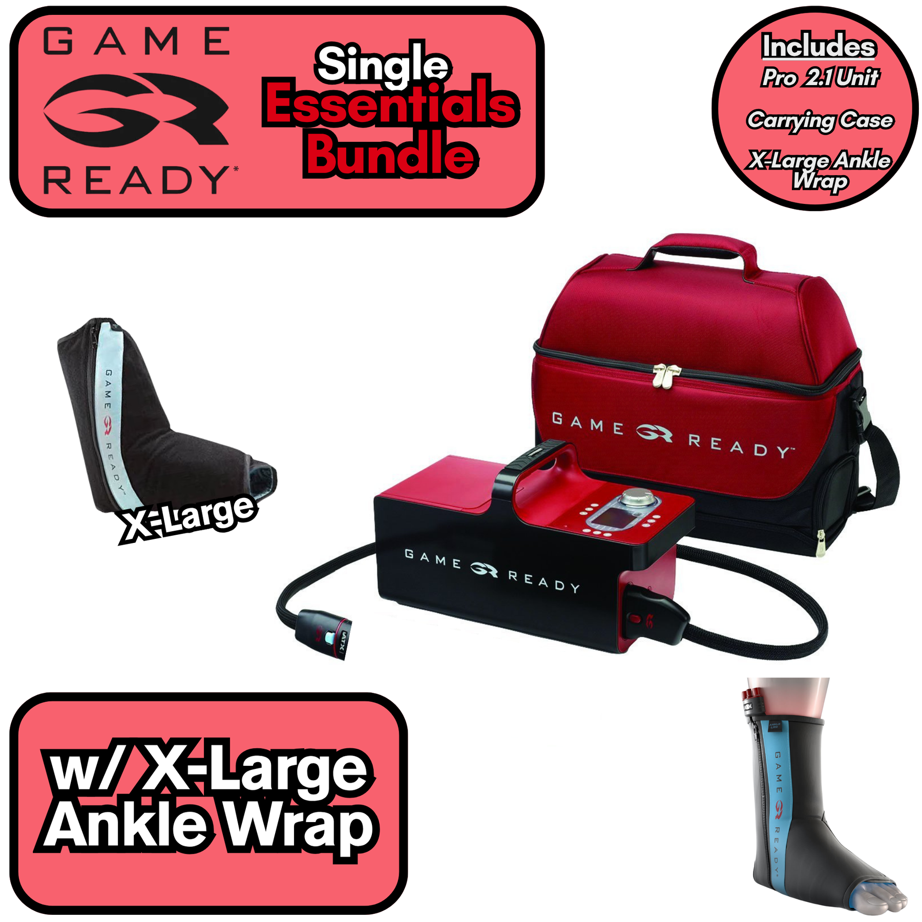 The Game Ready Single Essentials Bundle includes the Pro 2.1 System, 2.1 Unit Carrying Case (Holds unit and up to 4 wraps), and a Game Ready Wrap of Your Choice.