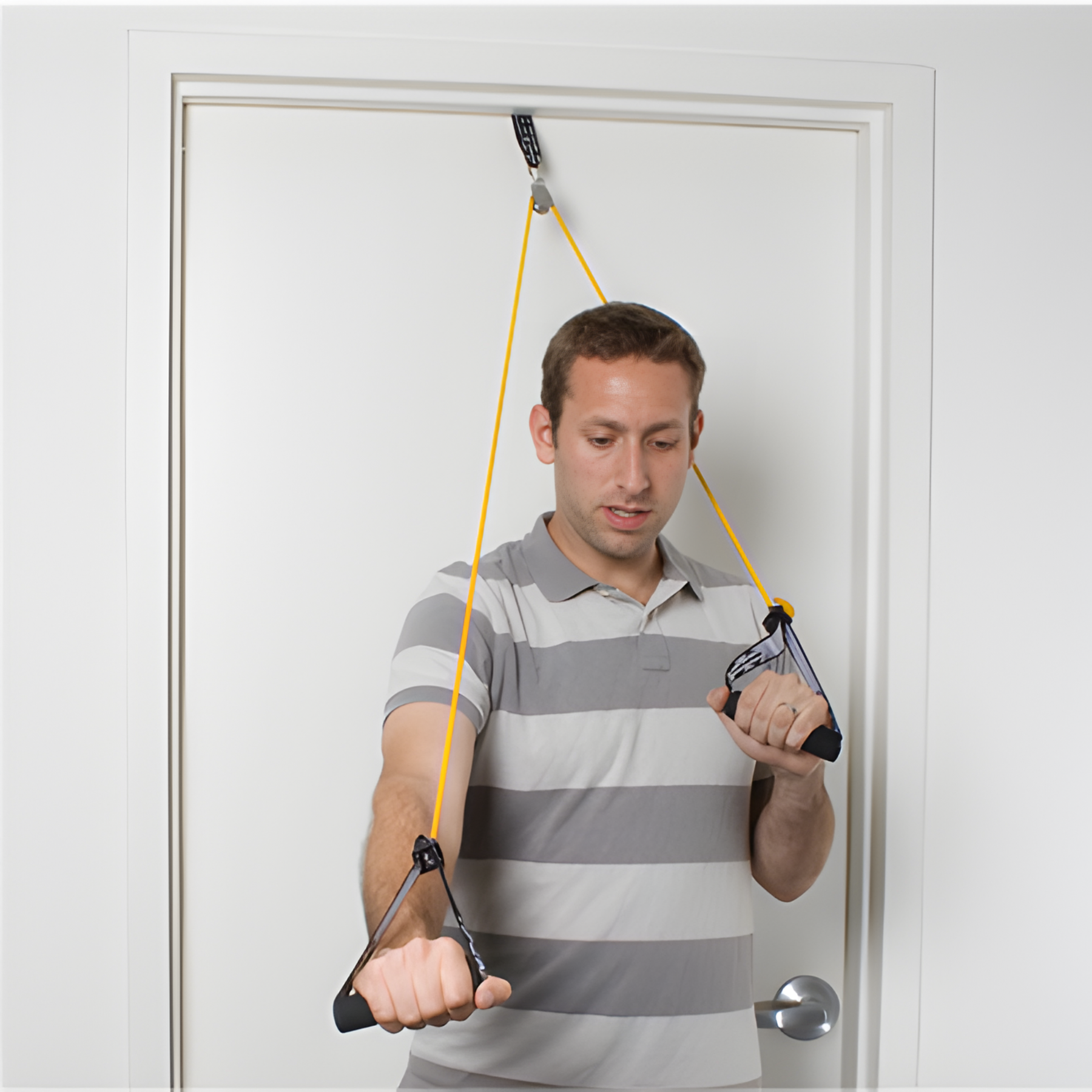 Developed for physical therapists, occupational therapists, sports medicine professionals, and individuals working on shoulder mobility, this shoulder pulley system combines resistance tubing, ergonomic handles, and a smooth swivel pulley to provide controlled, functional movement that can accelerate recovery and improve shoulder strength.